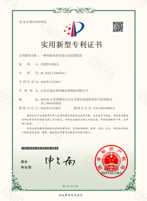 養(yǎng)殖雞舍高效自動清糞裝置證書